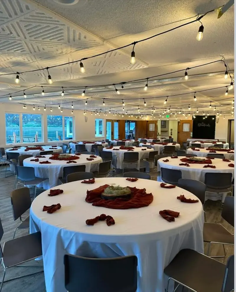 The Main Hall The Main Hall serves as a large hall for dancing, dining, or other large events. FURNISHINGS 12 – 6′ diameter round tables, each 29″ high 16 – 30″ x 72″ rectangular tables, also 29″ high each 125 – metal stacking chairs with 18″ high seats 13 – padded folding chairs. FIRE CODE CAPACITIES 114 with tables and chairs 245 with only chairs 343 with no furnitureThere is a french door to the deck from this room.Floor Plan